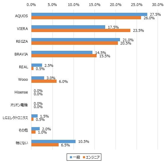 「AQUOS」(27.5%)「REGZA」(21.0%)「VIERA」(17.5%)の順に多かった。