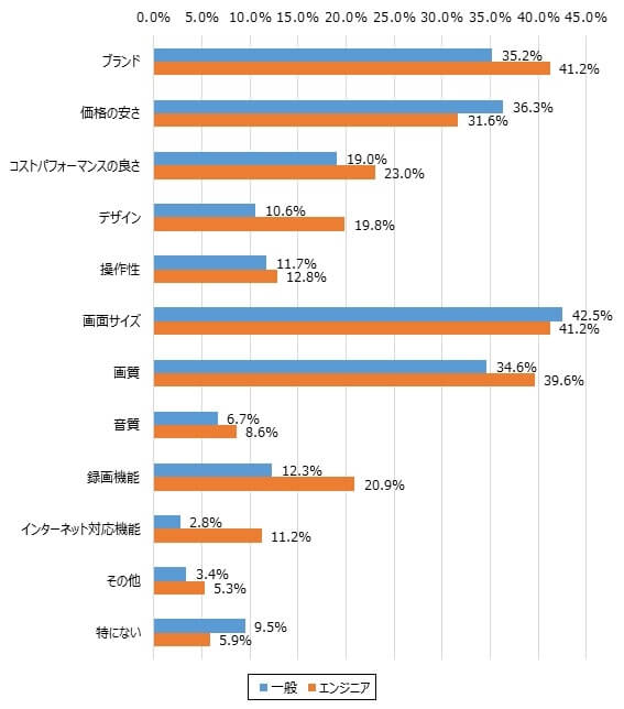 テレビを選ぶときの重視ポイントで、一般層とエンジニアで5%以上の差が開いたのは以下。