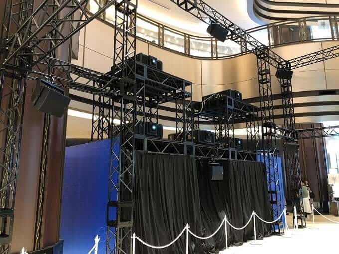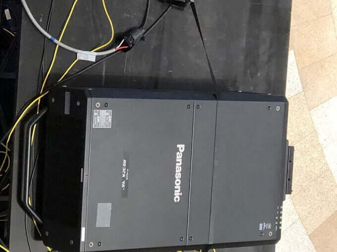 こちらのプロジェクターは、PT-RO32Kというパナソニックの業務用4Kプロジェクターでした。全部で5つ設置していますが、外側の4つで本番は投影します。真ん中のプロジェクターは映像を繋ぐ際の調整用に使っています。